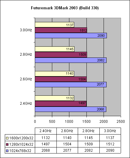 The differences between CPU speeds for the 3DMark03 test are relatively insignificant. For every 200 MHz, the scores increase by 0.3%. From 2.4GHz to 3.0GHz, our score only increased by 22 points (1.1%). This is well within the standard margin of error. This test shows that the CPU has only a 4% impact during the test, suggesting that the video card is the limiting factor in this case.