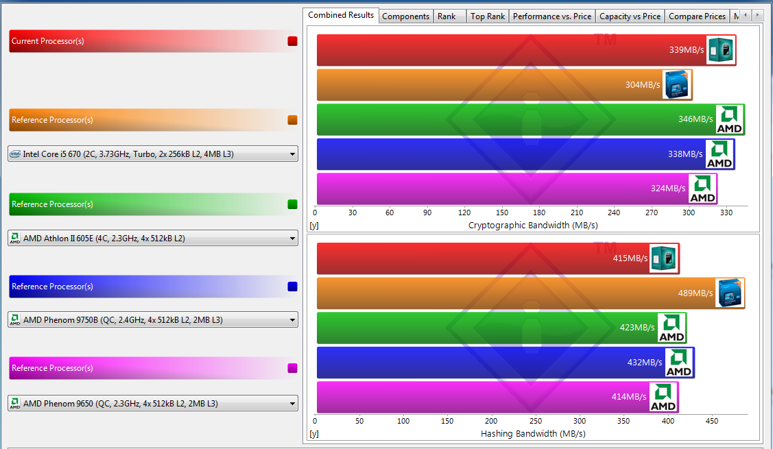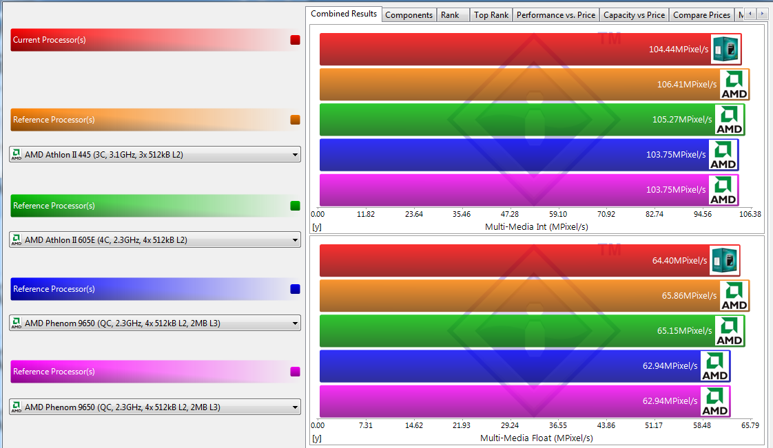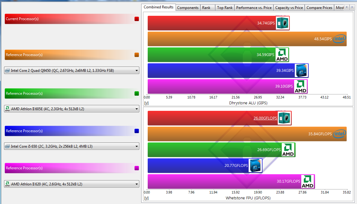 The latest edition of SiSoft Sandra follows the tradition of testing the pure synthetic power of processors. We ran our test comparisons as shown against equivalent processors made by both Intel and AMD. Lets see how the AMD Athlon II 440 x3 fairs against others.