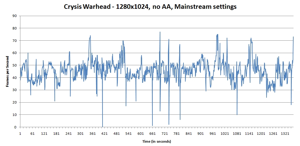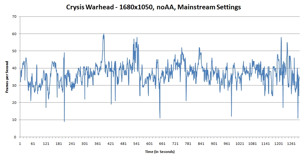 With the synthetic benchmarks out of the way, we now seek to answer the question: “How well does it run Crysis?” For these tests, we kept detail settings on Mainstream, to keep the GPU from bottlenecking things unduly. For this test we ran through the first part of the first level, which features dense jungle, heavy firefights, and a glorious sunrise over the ocean.