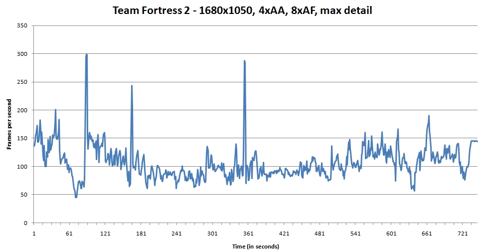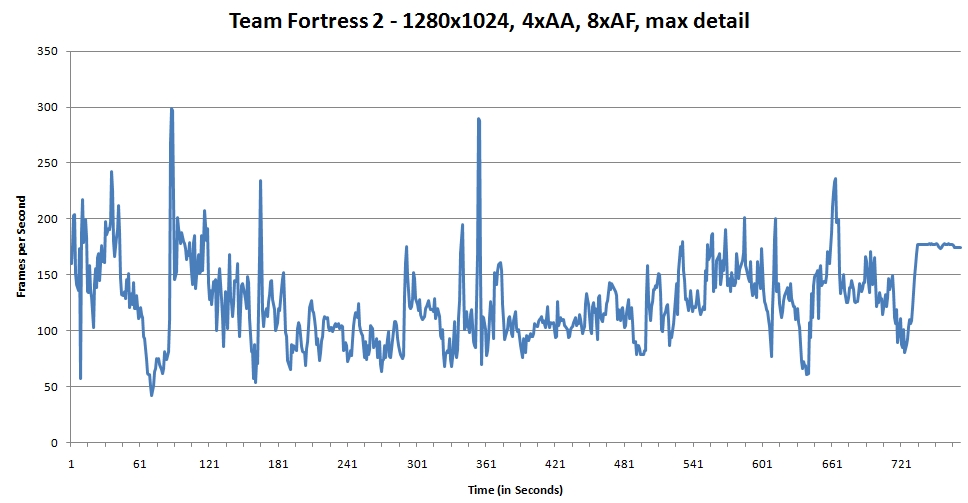Continuing on with the testing, I next ran this CPU through its paces with Team Fortress 2. While it’s been out for a while, Valve has been continually polishing the balance and game engine on this crowd-pleaser, keeping it fresh for quite a while. For these tests, I chose a timedemo of a recent competitive match in cp_badlands, which can be found here. Unfortunately, one of the players’ computers crashed around the 12 minute mark, but the first 12 minutes are quite hectic enough to put this game through its paces.