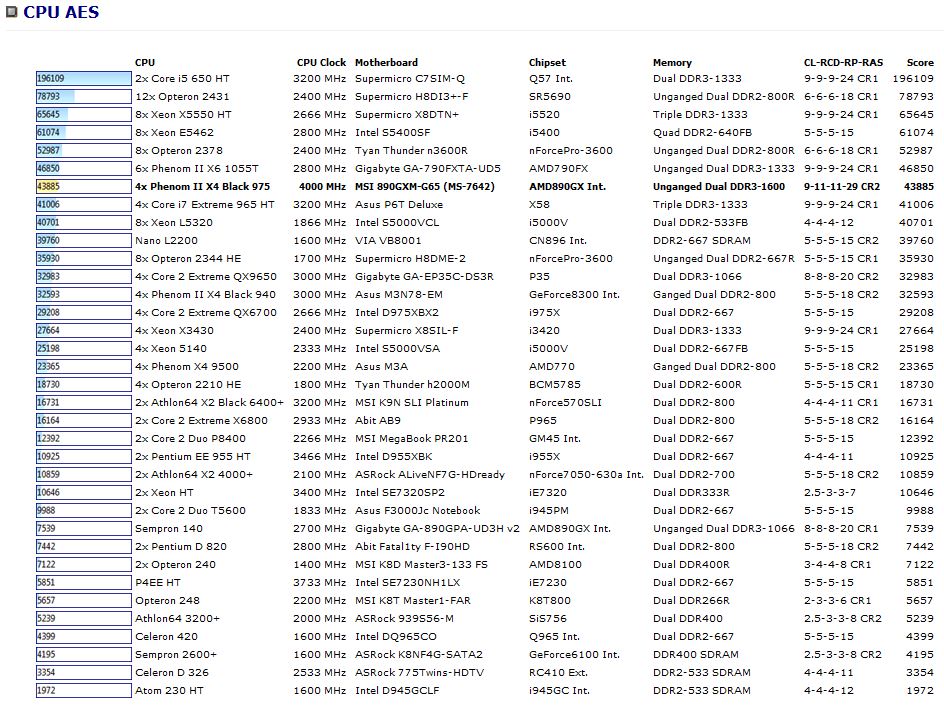 CPU AES test uses only the basic x86 instructions, and it’s hardware accelerated on VIA PadLock Security Engine capable VIA C3, VIA C7 and VIA Nano processors; and on Intel AES-NI instruction set extension capable processors. The test is HyperThreading, multi-processor (SMP) and multi-core (CMP) aware.