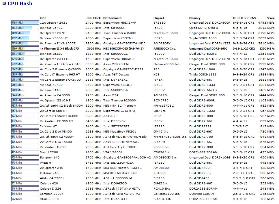 This benchmark measures CPU performance using the SHA1 hashing algorithm defined in the Federal Information Processing Standards Publication 180-3. The code behind this benchmark method is written in Assembly, and it is optimized for every popular AMD, Intel and VIA processor core variants by utilizing the appropriate MMX, MMX+/SSE, SSE2, SSSE3, or AVX instruction set extension. CPU Hash benchmark is hardware accelerated on VIA PadLock Security Engine capable VIA C7 and VIA Nano processors.