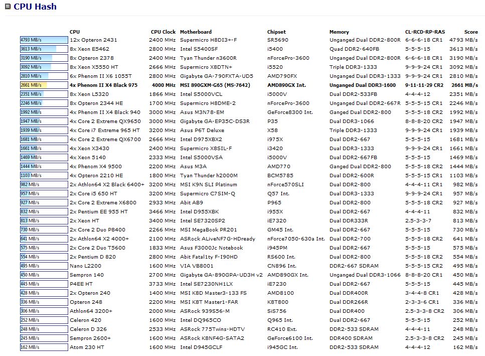 At stock speeds, the 975 has a throughput of 2399 MB/s. When overclocked, the throughput is bumped up to 2661 MB/s, this isn’t enough to make it move up in rank however.