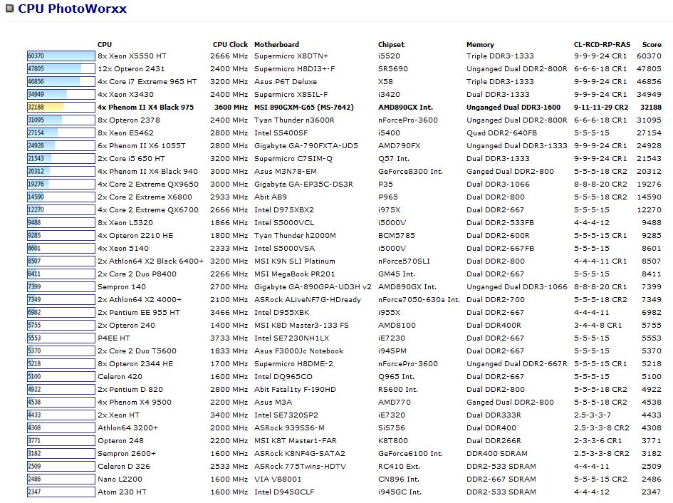 The higher clock speed of the 975 helps it beat the 1055T right out the door, with a score of 2790. With the overclock, it comes in second to the 12 core Opteron 2431, with a score of 3093.