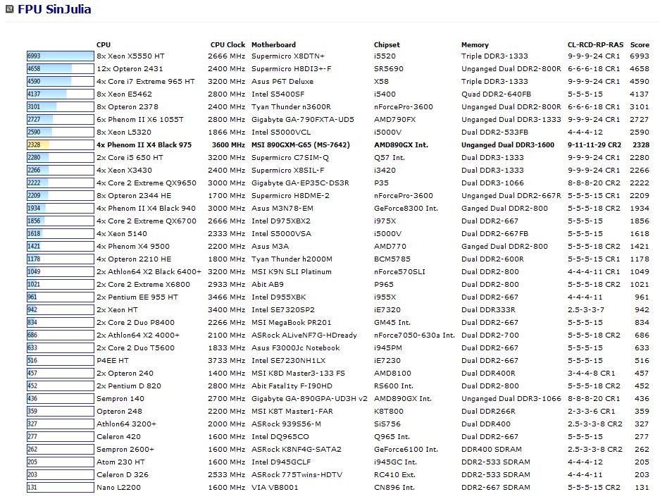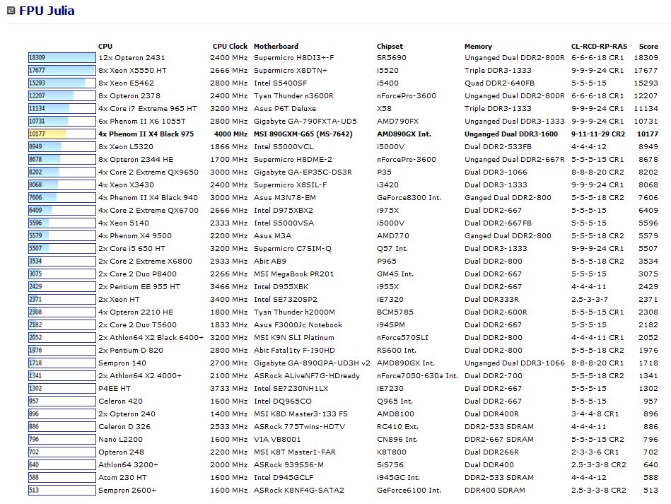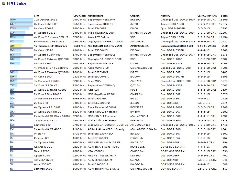 This benchmark measures the extended precision (also known as 80-bit) floating-point performance through the computation of a single frame of a modified “Julia” fractal. The code behind this benchmark method is written in Assembly, and it is extremely optimized for every popular AMD, Intel and VIA processor core variants by utilizing trigonometric and exponential x87 instructions. FPU SinJulia is HyperThreading, multi-processor (SMP) and multi-core (CMP) aware.