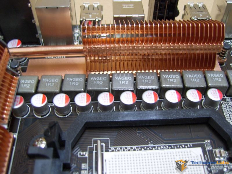 Taking a look at the backside of the main heat sink we can see that heat disipation is unobstructed. The right photo is a close up of the heat pipe setup on the NorthBridge and a close up of the featured “100% High-quality Japan-made Conductive Polymer Capacitors! (VRM 5000hrs lifespan @105°C, 500,000hrs @65°C)”