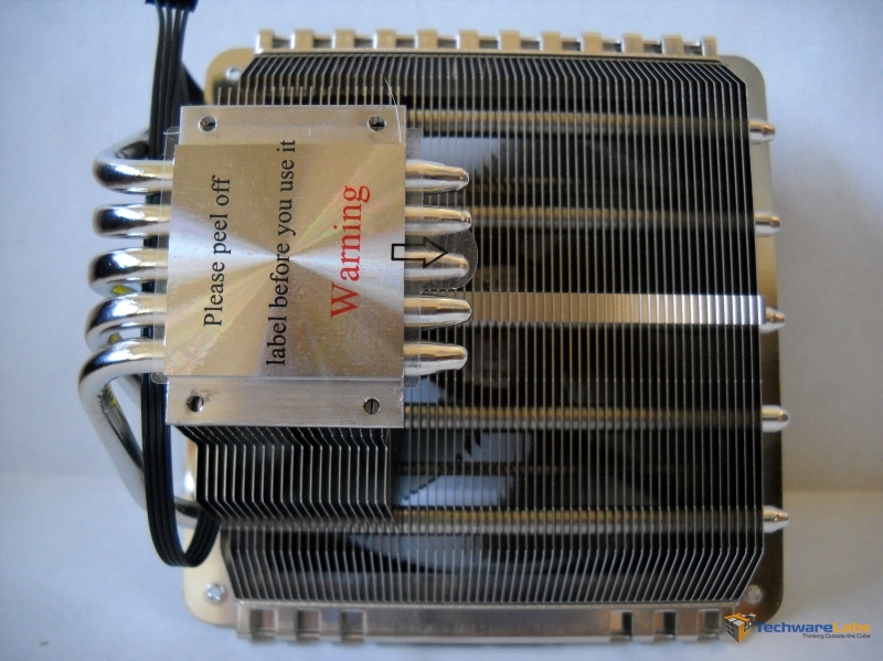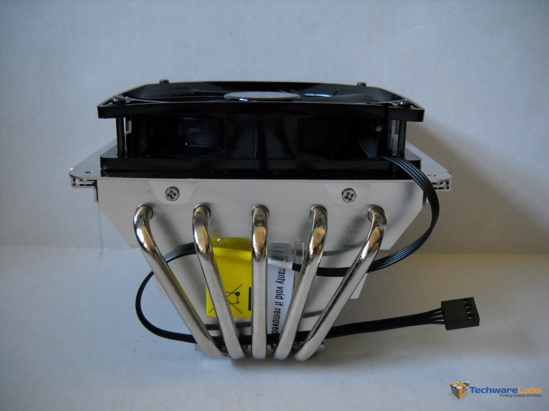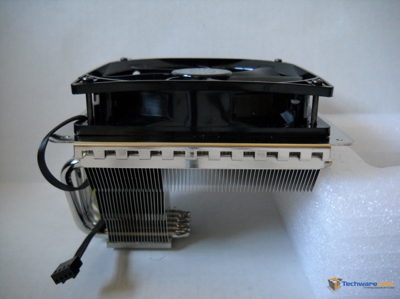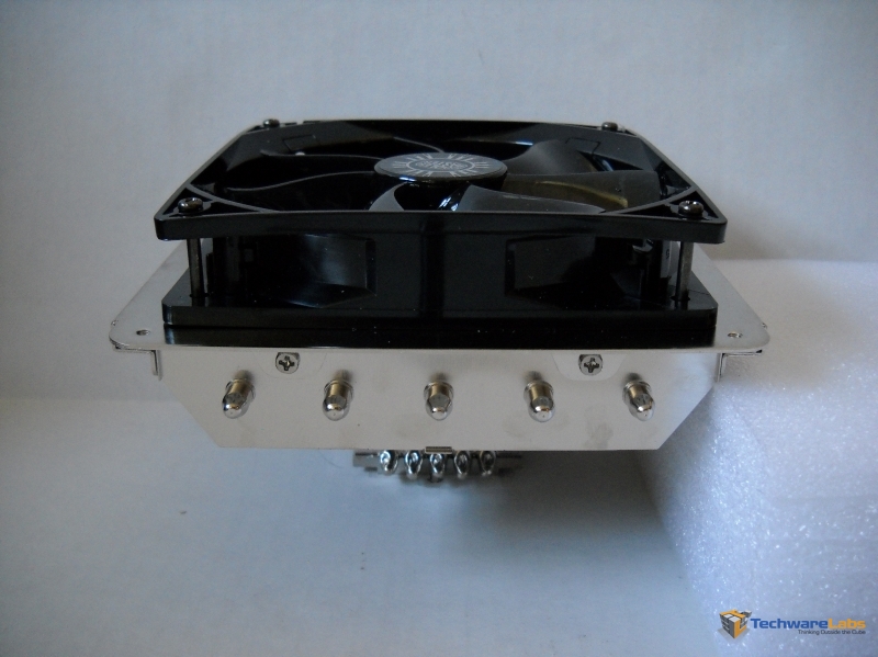 Here we see the included fan which appears to be Cooler Master’s XtraFlo 120 though the specs are slightly different. In the middle we have the base of the cooler. This give you an idea of how large the heatsink itself is compared to the socket. Lastly we see the cooler with the fan uninstalled and the heatpipes in the fins.
