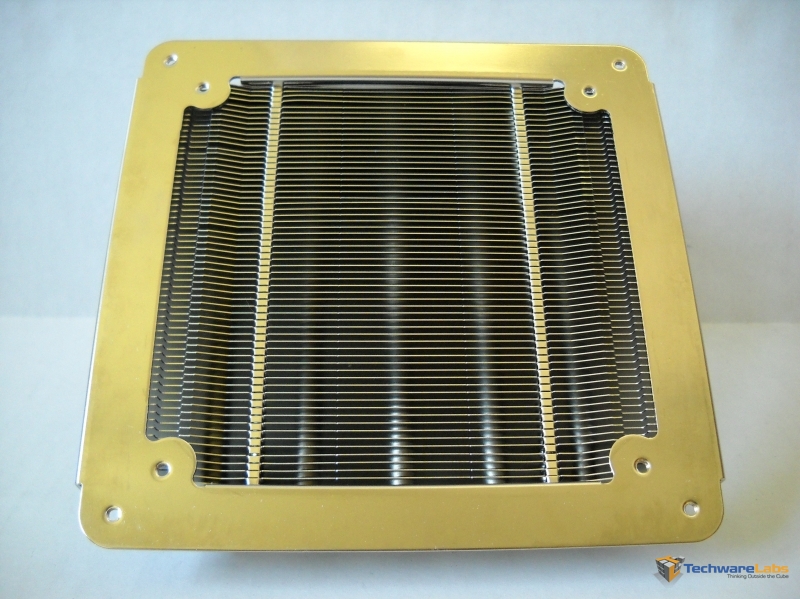 The cooler itself is a fairly simple design, with heat pipes running from the base up to the fins. The difference between this cooler and most other aftermarket coolers though is obviously the orientation. Many coolers are the vertical “tower” style where the air is blown out towards the back of the case rather than this horizontal style where the air is blown down at the motherboard. The main advantage of this style is that components underneath the cooler, such as RAM or motherboard MOSFETs, are cooled as well.