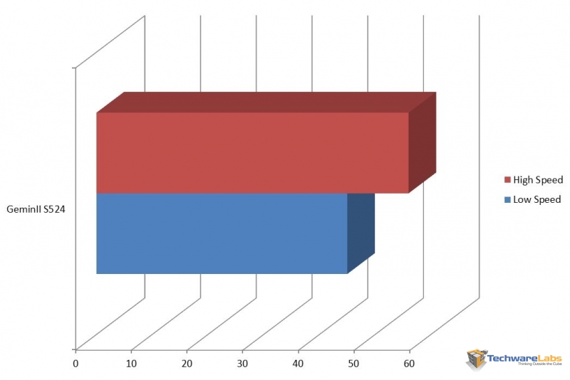To test the noise level of the GeminII, I placed a decibel meter about 12 inches from the fan and took the average reading. At it’s lowest speed, roughly 800 RPM, the cooler registered at only 45db. With the case door on and the case sitting a few feet away, the noise was virtually inaudible.