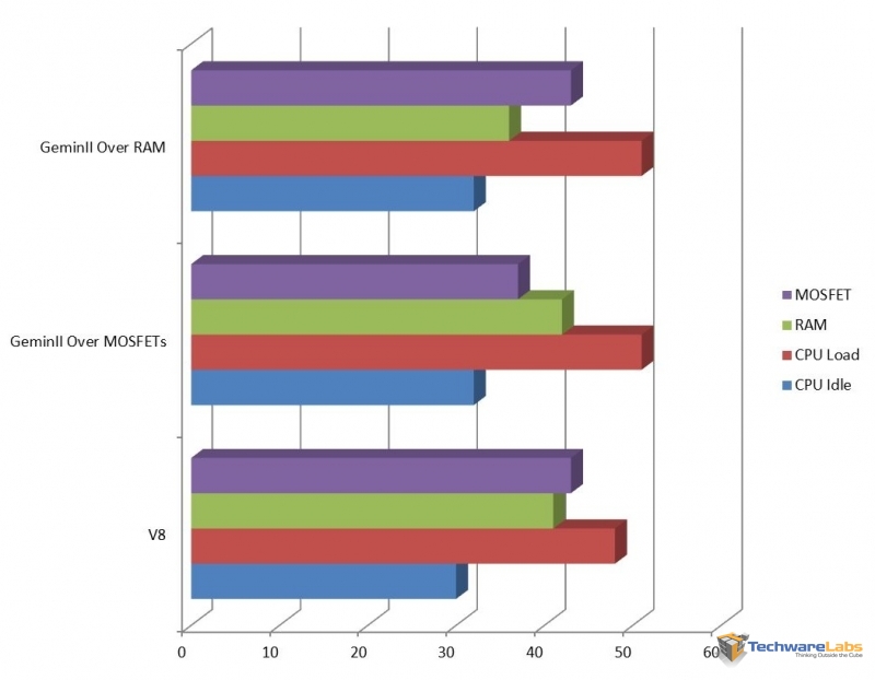 To test the overall effectiveness of the GeminII we took not only the CPU temperature, but also the RAM and motherboard MOSFET temps using a thermometer gun. These results were then compared to those of a tower style cooler, the Cooler Master V8. All temperature readings are in degrees Celsius. Noise level was measured using a standard decibel meter approximately 12 inches from the fan.