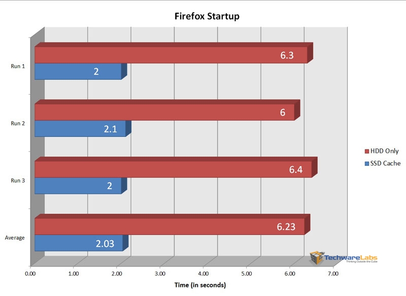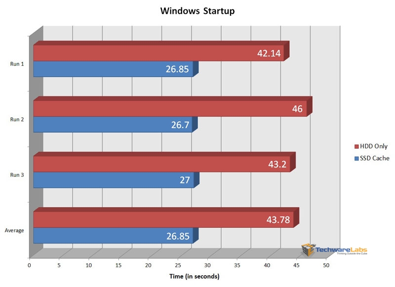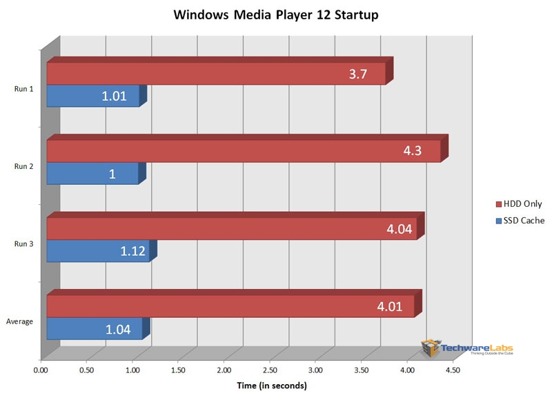 Windows Media Player boot time also fared much better with the cache drive, dropping from 4 seconds to just 1 second.