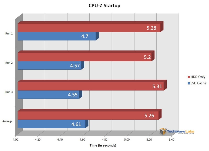 I thought I would try out CPU-Z start time because I felt that it would rely less on the hard drive so would be a good gauge for programs like it. As we see here, from clicking the icon to fully loaded was less than a second difference between the two setups as expected.
