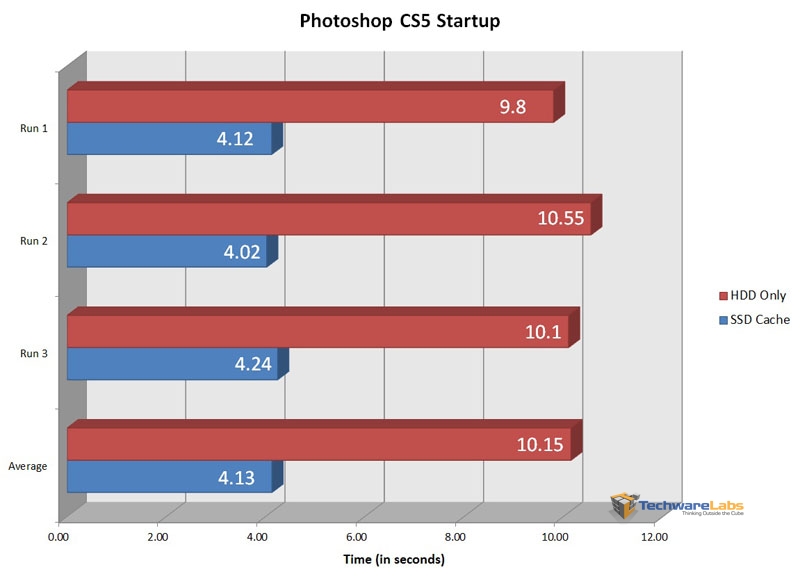 Photoshop start time is another classic benchmark for drives because it has to pull so much stored information. As expected, the Adrenaline made a massive difference, lowering start up from roughly 10 sec. to around 4.
