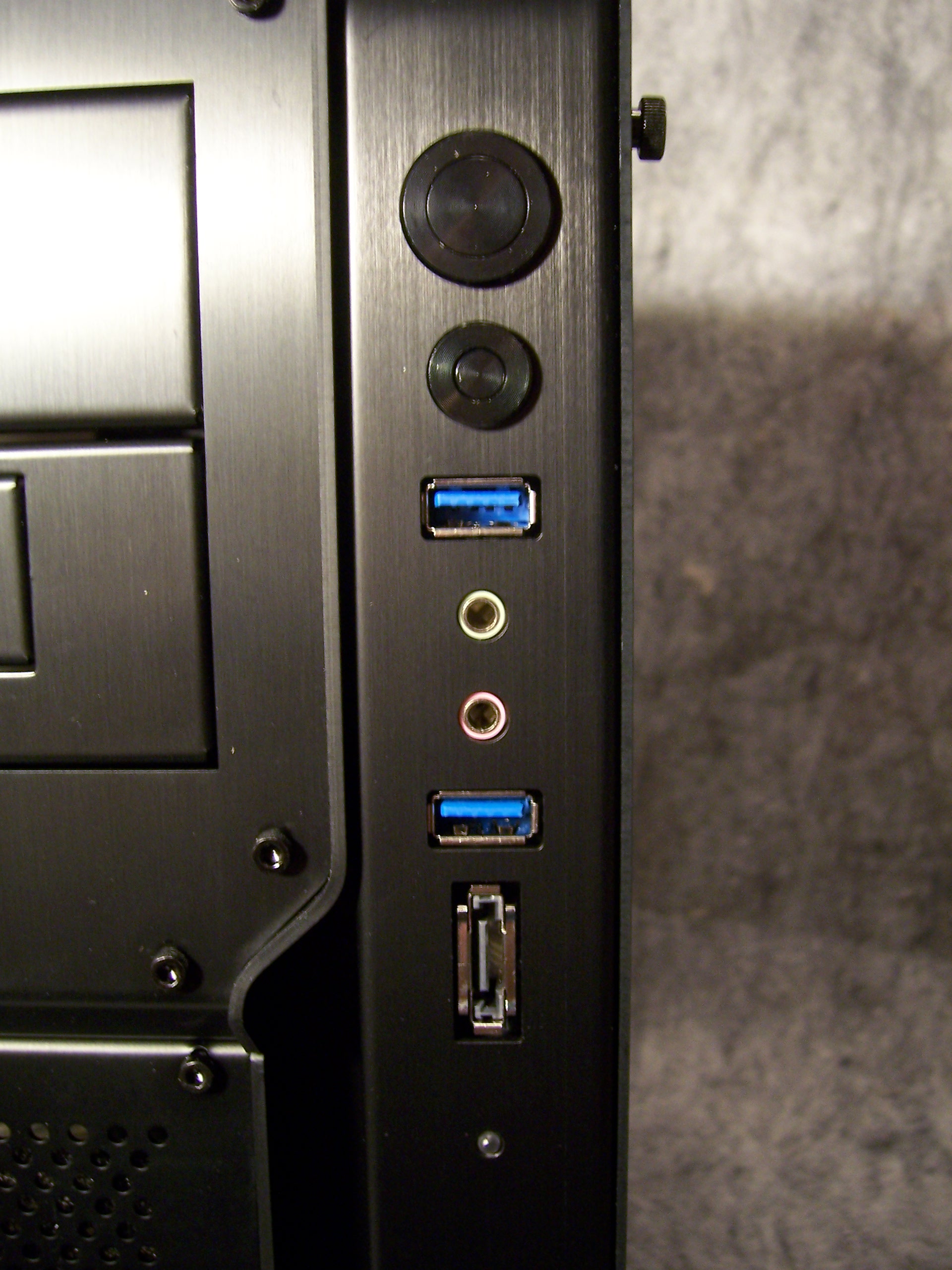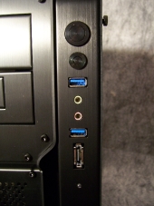 The Mini Tank is well put together, and the aluminum body is always cool to the touch and not easily scratched. It has sturdy rubber feet that keep the system half an inch off the floor, giving space for air to flow into the ventral intake and directly into the power supply. The front panel options are simple and utilitarian, but include USB 3.0 capable ports as well as headphone and microphone jacks for an easy place to plug in your gaming headset. There isn’t a separate power light, but the glowing front fan will never leave a doubt of whether you’re ready to roll. The reset button, however, is so tiny it can’t be pressed without filing your fingers into tiny points (or maybe if you used a pencil). The exterior is held together with small thumscrews and tiny shred-your-thumb screws, but all of them are slotted for an alan wrench which is thoughtfully included. It made taking the system apart for installation and mantainence a breeze. It even has a removable air filter at the front to keep your interior clean.
