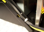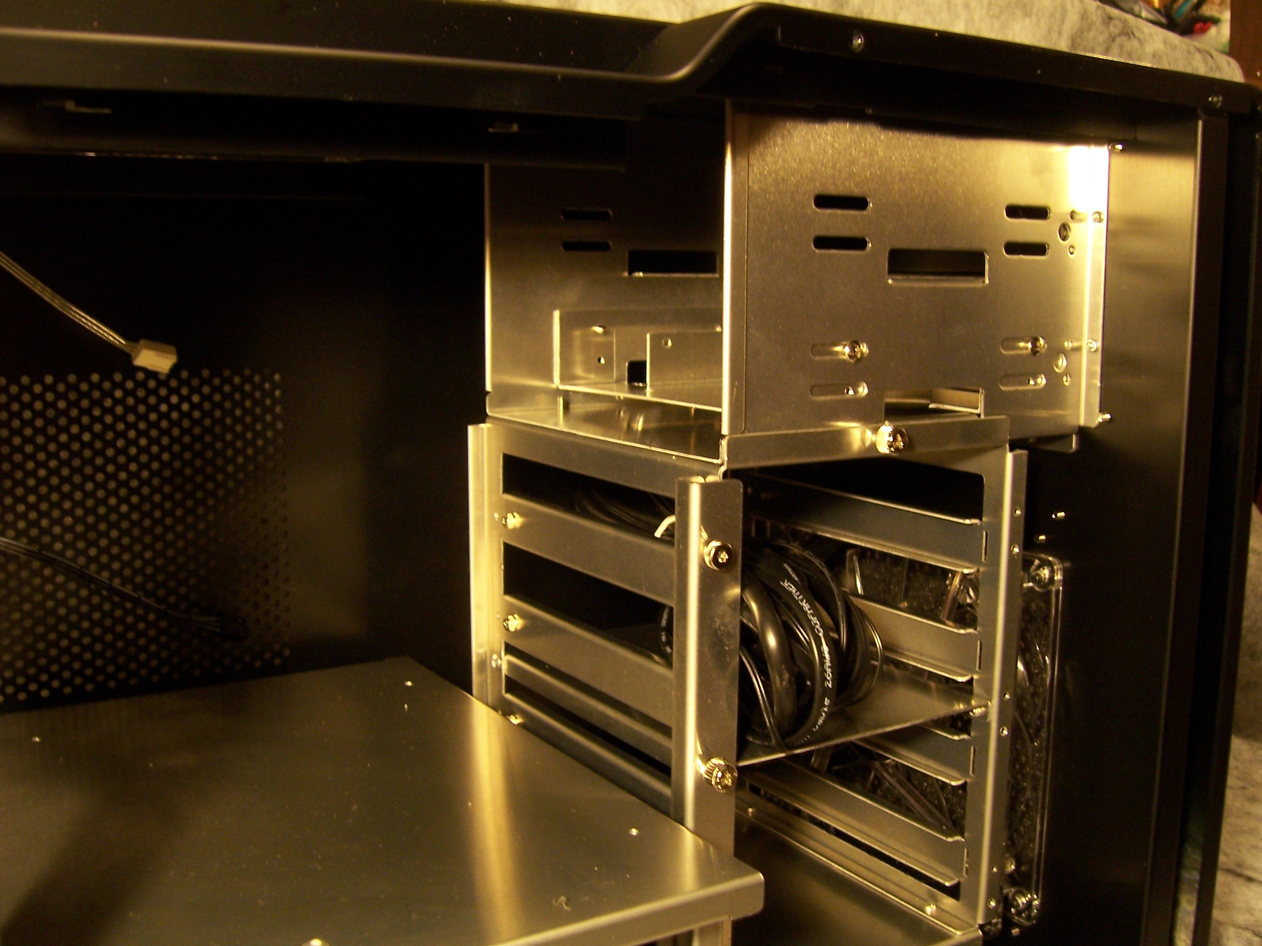 The inside is spacious and well thought out. The giant 140mm fan at the front is positioned directly in front of the hard drive rack, allowing airflow to pass through and between your drives. Another 140mm fan at the top will pull rising heat directly from the motherboard, and the 120mm fan at the rear will complete the flow of air from the front, leaving no space for air to sit stagnant and heat up. The side cavities are surprisingly good for cable routing, keeping all cables off to the side and out of the way of the life-giving airflow. The 3.5″ hard drive mounts consist of rubber “tires” that squeeze into rails on the rack, giving the drive zero chance to vibrate and rattle the case. The 2.5″ hard drive mounts are under the 3.5″ rack, and attach using traditional screws. There’s room for two drives, and they’re spaced apart – but it seems to be out of the main airflow, so heating might become an issue if you have two drives installed down there.