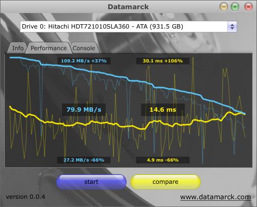 Our Hitachi HDT721010SLA360 read at an average of 79.9MB/sec with a 14.6ms latency according to Datamarck. Datamarck can be found on our downloads page.