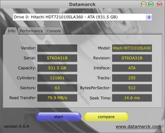 Datamarck provides some basic information about our hard drive, including the capacity and benchmark results.