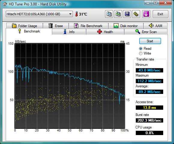 HD Tune reports to us that the HDD reads at an average 89.2MB/sec, about 10 higher than the Datamarck test above. We also see 13.8ms here compared to the 14.6ms above.