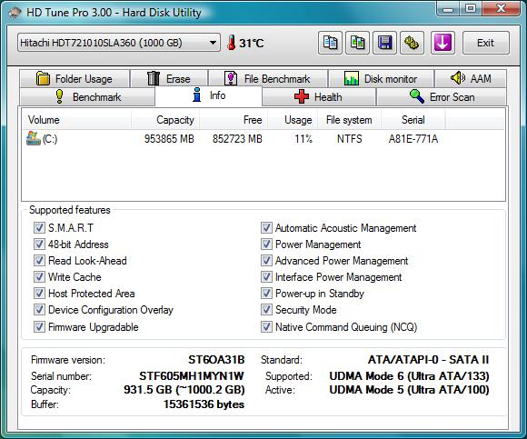 HD Tune also comes with an info section, which reports the capacity, as well as the supported HDD features.
