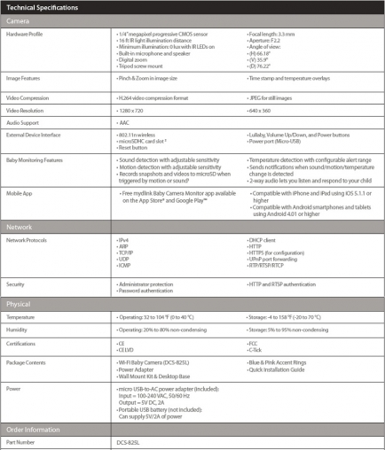 If the stork has recently dropped by your house with a new bundle of joy and you’re a proud (and soon to be exhausted) mommy or daddy, one of the basic survival items you will need in your arsenal is a baby monitor. Hands down, this piece of technology is simply something no parent should be without…especially if this is your first child. It’s amazing how being able to see and hear your new baby when they are napping will not only make you more responsive to their needs, but it will also help ease the paranoia with all the little sounds they make that without video would normally result in your getting up and checking on them insistently. These days there is no shortage of video baby monitors on the market. And where that would generally be a good thing, speaking from personal experience, not all baby monitors are created equal. With that said, a friendly piece of advice, research extensively before you buy. Since video baby monitors are not cheap, rushing into a purchase could result in a serious case of buyer’s remorse. Now that I have stressed the importance of doing your homework before purchasing a video baby monitor, how about we look at one of the latest entry’s on the market, D-Link’s DCS-825L HD Wi-Fi Baby Camera. Now if D-Link isn’t a brand that immediately springs to mind when you’re looking for baby monitors, you’re not alone. D-Link has a long history of producing some excellent network (switches, routers, wireless AP’s, etc…) and connectivity products and that includes an extensive line of network attached video camera’s. So it not surprising that D-Link has decided to leverage their know how and produce a Wi-Fi connected video baby camera. Having the video baby camera Wi-Fi connected, this allows viewing from any iPhone, Android, or remotely on a PC (via their free secure web service). The only question is, how well did they do? Let’s dive into the details and see how well the DCS-825L HD Wi-Fi Baby Camera performs. Before we get into the on-hands, let’s take a peek at the technical specifications: