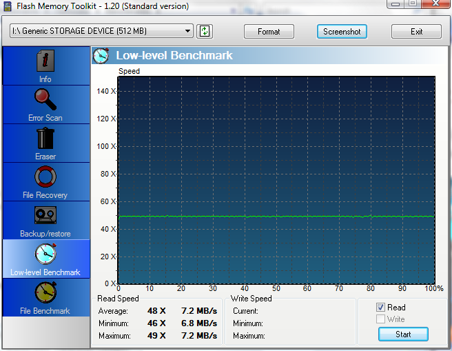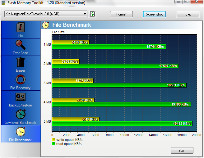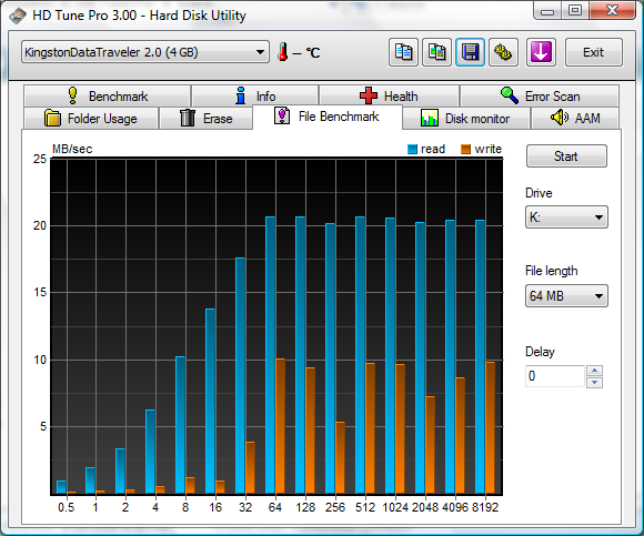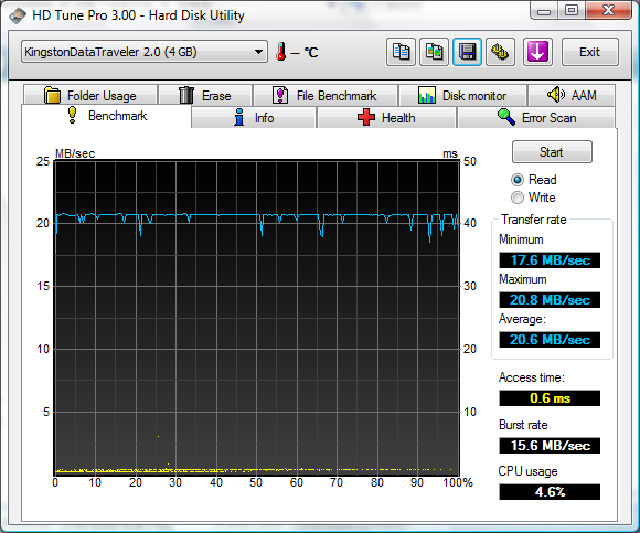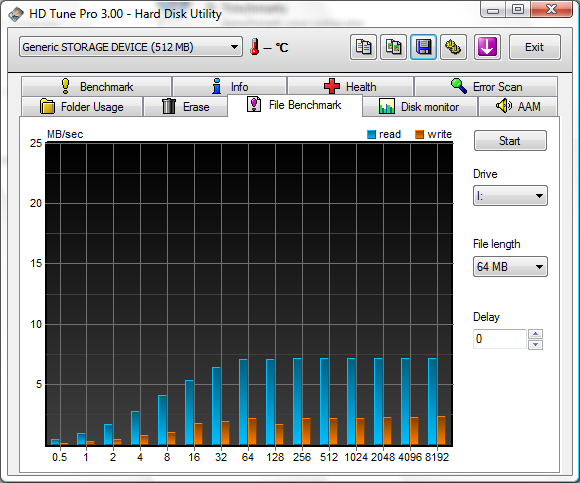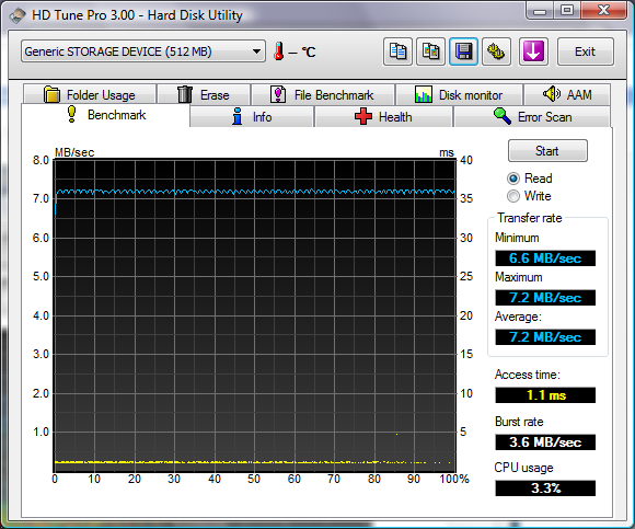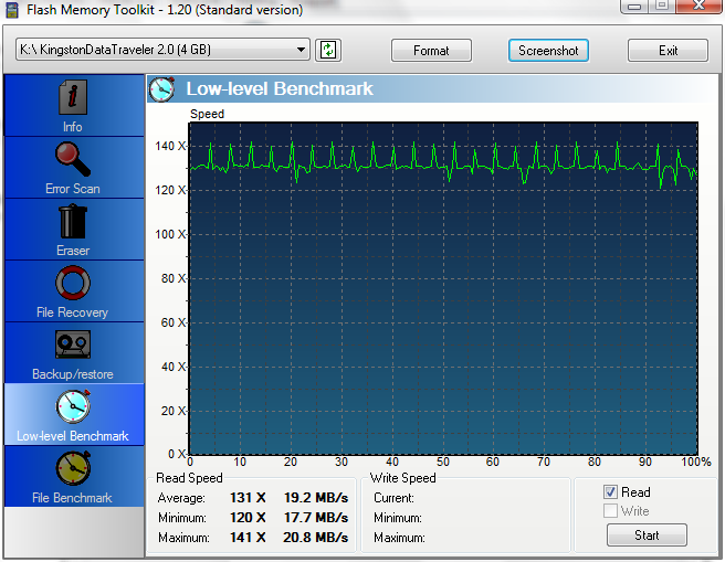 To benchmark the D-Link DUB-CR200 I used Flash Memory Toolkit and HD Tune Pro to do a comparative test of the read and write speeds of a Kingston SD card and a Kingston 4GB flash stick that were plugged into the D-Link DUB-CR200. Here are the results.
