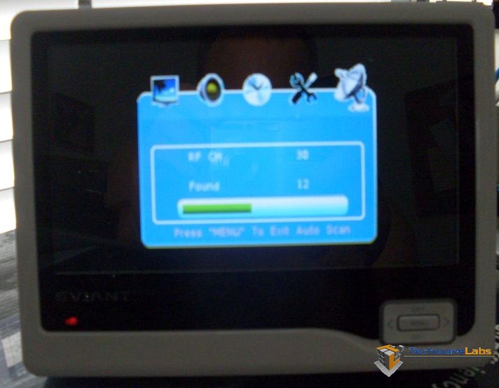 Powered on, the initial screen shows this splash screen which is a very sharp and colorful picture. | Shown here is just one segment of the menu while the TV is scanning the air waves for a digital channels. |