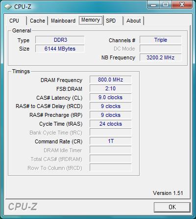 CPU-Z tells us that we’re running a 6GB kit in triple channel at 1600MHz (800:1 x 2) and our timings are 9-9-9-24. It seems that our settings are correct, so now we move on to MemTach: