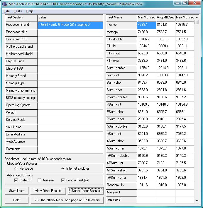 From MemTach, we can extract the information that our RAM’s memset is 4338.1 MB/sec and memcpy is 7466.8 MB/sec. The entire benchmark took 16.04 seconds to run.