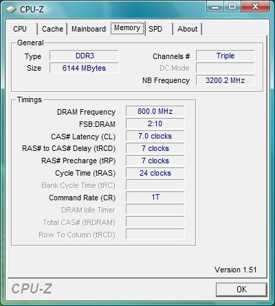 CPU-Z tells us that we’re running a 6GB kit in triple channel at 1600MHz (800:1 x 2) and our timings are 7-7-7-24. It seems that our settings are correct, so now we move on to MemTach: