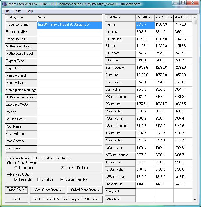 From MemTach, we can extract the information that our RAM’s memset is 8916.7 MB/sec and memcpy is 7768.9 MB/sec. The entire benchmark took 15.34 seconds to run.