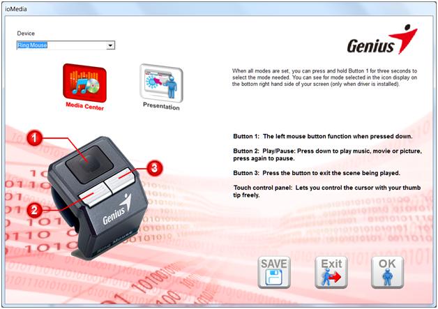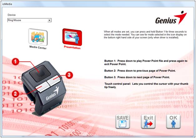 When you put in the CD and let it automatically execute the installation is short, sweet, and to the point. After the installation you will want to launch the ioMedia software. Here you can select which Genius device you want to manage, if you happen to have more than just the Ring Mouse. You are given two modes to choose from and save. These modes, mentioned earlier, are Presenter and Media.