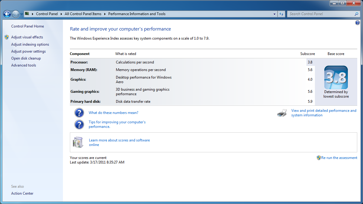 The scores in the previous tests are further verified by the Windows built in benchmark. As you can see in the images below, The performance of both machines are relatively matched. It is important note that the ION 2 Platform in the JNC98 performed better than the Radeon HD 6310 performance in the E350N. On the flip side, however, it is rather disappointing to see the 1.8 GHz Atom lose out to a slower (yet faster) 1.6 GHz, E-350. The overall score is rated by the lowest component, which in both setups happens to be the processor. This means that E350N wins this test as it deliver “better overall performance” according to Windows.