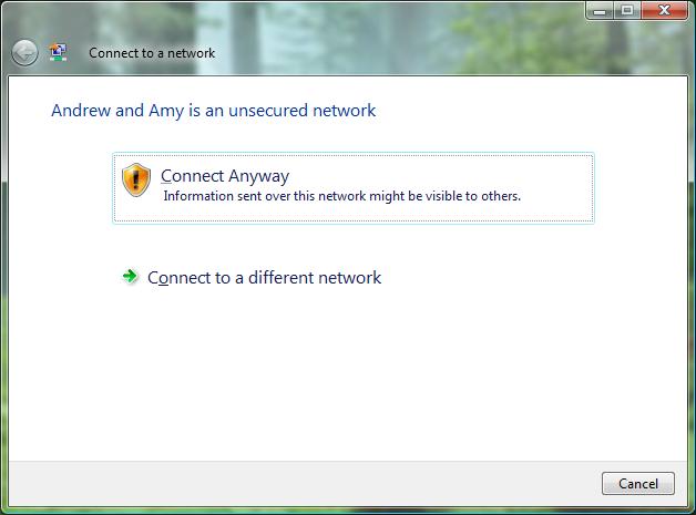 Select the "Connect Anyway" option in the dialog box that opens. This menu is warning you that the network is unsecure and that your data may potentially be accessible by other people. Even though this is true, most public networks have security enabled that prevents one user from accessing another files. |
