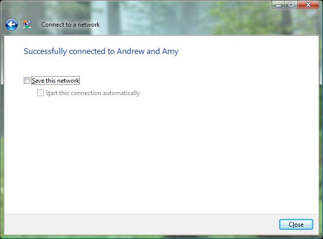 When you have sucessfully connected to the network you chose you will be asked if you want to save this location so that Vista automatically connects to this network again if you come back. Select the"Save this Network" and "Start this connection automatically" if these are your preferences. |