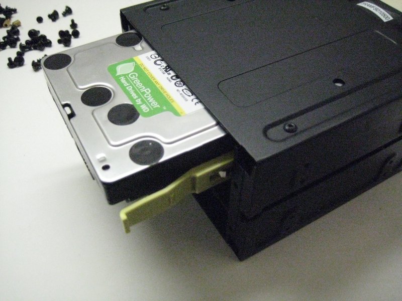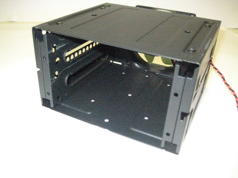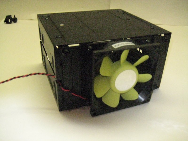 The hard drive cage in the Dragon Slayer cage is removable. In fact in order to install the drives inside the cage, the cage first has to be removed from the case. This can be done by removing the 2 pins on the side of the cage, remove the 2 front covers on the front of the case and the slide the hard drive cage out. While this may seem like a cumbersome task, it does facilitate the installation of the hard drives. The slide rails are then attached to the hard drives by screws and the hard drives just slide into the cage. This process is illustrated in the pictures below.