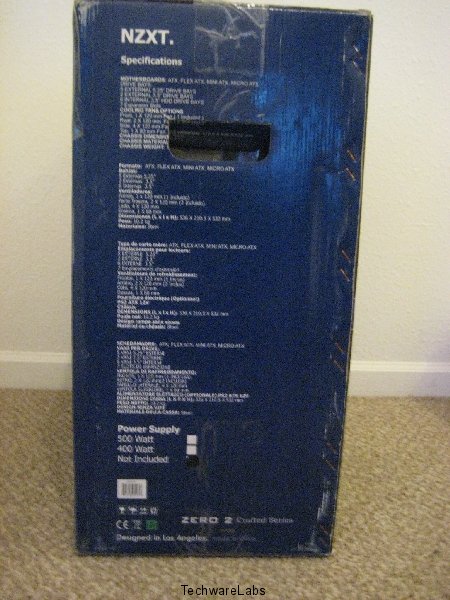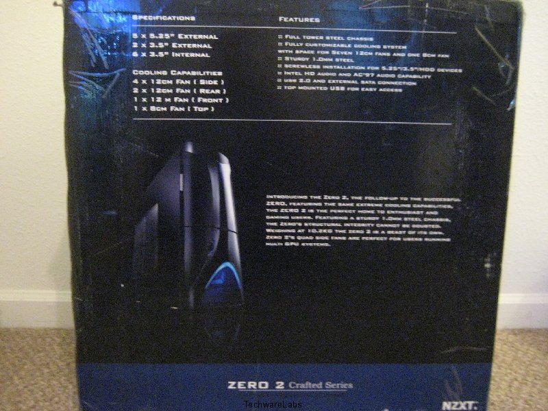 The packaging seems to be very typical of NZXT’s theme as seen with their other cases; such as the Khaos. The front of the packaging as well as the rear give a 3/4 view of the Zero 2 chassis with the front lights lit up, giving it a “halo” like effect from it’s already somewhat sinister look. From some perspectives it also looks as if the case itself is frowning. Very odd. The back and sides of the box generously display the features and specifications and NZXT’s marketing statement.