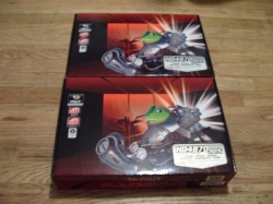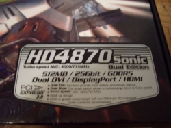 The Palit Radeon 4870 Sonic Dual Edition comes packaged in a nice eye catching box featuring their bionic frog, or frobot as they like to call it. I like the fact that they don’t plaster their logo everywhere, like most companies, and fill up the remaining space with logos of certifications. Palit keeps it nice, simple, and artsy. They only have a few logos and show a very nice graphic of their mascot.