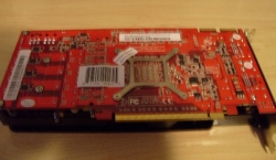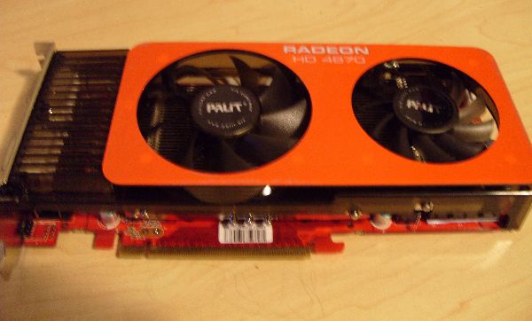 Taking a closer look at the Palit Radeon 4870 Sonic Dual Edition, we see that it has a few features that set it apart from the rest. This card is a beast, taking up two pci slots. This is to accommodate the large heatsink, dual fans, and heatpipes that this card has attached to it. The color that they used on the card would not be my first design choice. The solid orange color makes it look kind of cheap and plastic like.