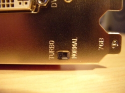 The “Smart Switch” brings back nostalgic memories of one of my first computers and how it had a turbo button on the front to give it that extra boost. In this instance, the switch allows the card to switch between BIOSes to safely overclock the card. In the normal position, the card has a core clock of 750 MHz and a Memory clock of 950 MHz (which is still higher than the stock 4870 specification of 900 MHz). When in the turbo mode the card switches to the other BIOS and has a core clock of 775 MHz and Memory clock of 1000 MHz.
