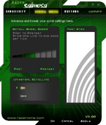 The driver software installs very quickly, and opening the Customizer first presents you with this window. The slider on the left controls overall pointer sensitivity, while the green horizontal meter on the right controls double-click speed. The bullseye on the lower right gives you a quick way to test your double-click settings, it will ‘shatter’ if you’ve clicked fast enough to count. The on-the-fly sensitivity box in the upper right lets you choose whether or not to allow for in-game changes to sensitivity. This is accomplished by holding a mouse button bound to the sensitivity function and rolling the scroll wheel. Given that the Salmosa has no extra buttons, this feature seems largely impractical, unless you’re willing to give up mouse3 to the task.