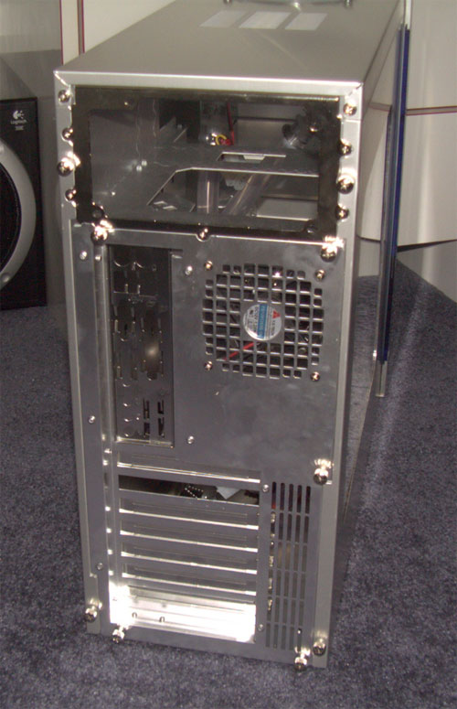 Moving to the back of the case there is nothing special to see really. Located on the back is a 80mm blowhole to exhaust warm air from the case. What you will also notice is the power supply bracket which is similar to the ones on Lian Li cases except there are no thumbscrews used on the bracket. There is also a 80mm blowhole at the top of the case which is standard and then there is the 120mm Enermax fan which sucks air off of the radiator. Looking to the bottom of the case now there are 4 round feet with rubber pads. The rubber will help prevent any vibrations depending on what surface the case is on and will allow the front door to be opened easily and not rub against the floor.