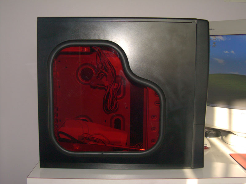 Now as I mentioned before this case comes with your choice of color window installed. The window takes up pretty much of the side panel and is not just a plain rectangle or circle. The window Frozencpu has decided to use for the Blizzard 900 is somewhat of an L shape. These windows are typically used in larger towers or even server towers but sure looks great on this case. With the optional cold cathode I received this case is phat. Also not to forget to mention the extra two USB ports and multimedia ports that are located on the bottom right side of the bezel. A nifty little accessory which I always like.