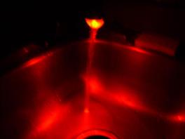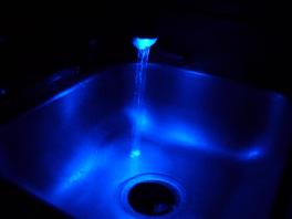 Eventually I got it all figured out and hooked up. It works on a pretty simple basis. There is a thermistor that is exposed to the running water. A thermistor is a device that changes resistance according to the temperature that it is exposed to. The circuit uses the water as a switch. There are 2 metal wires sticking out into the oncoming stream of water, and the circuit is complete when the faucet is turned on by using the water as a conductor. The faucet adapter comes on a small fraction of a second after the water is turned on and glows magnificently. The average threshold temperature was recorded by switching the water temperature back and forth numerous times. For a red to blue shift, which detects the presence of cold water, the temperature was about 95 degrees Fahrenheit. The average temperature for a blue to red shift was about 96 degrees Fahrenheit. This hysteresis effect, or dead-band between temperature switches, keeps the faucet from switching rapidly between red and blue LEDs, or having both on at the same time. Below are several pictures showing how it looks hooked up and how it looked during testing.