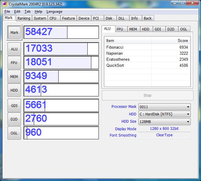 Similar in nature to the Sisoft Sandra benchmark the CrystalMark benchmark provides further information about several key areas of the system. These include FPU, ALU, Memory, Hard Drive, GDI, D2D, and Open GL information. What results is an overall system score made up of the combined scores of each of the sub systems.