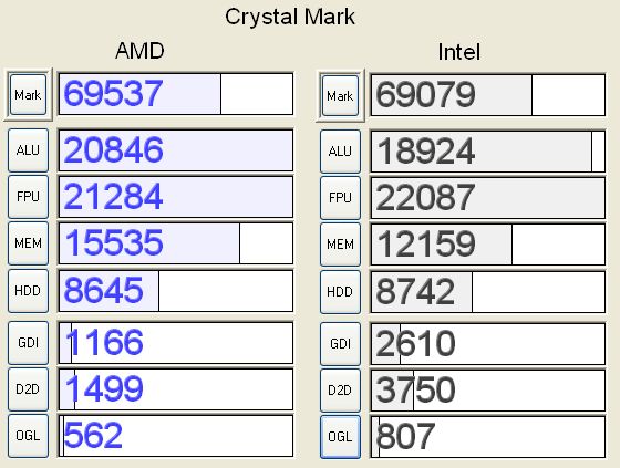 Just looking at the top three values on each ( the Alu, Fpu, and Mem ), you can see that the scores between the two is very minute. Yet there is a difference of 4500 which places AMD at 8% higher than the Intel processor. It is interesting to note that the INtel system shows higher performance in the Hard Drive, GDI, D2D, and OGL areas as well as a slightly higher FPU score. The AMD system wins out with much higher scores in the ALU and MEM due to the higher system clock speed and integrated memory controller.