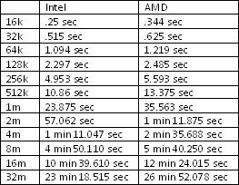 As we can see in the results of the test, the Intel E6420 was able to perform better at each and every different size interval althoughit is not until after the 256k interval that we begin to see any real world noticable differences. At 32M though the difference is sizable at more than 3 and a half minutes.