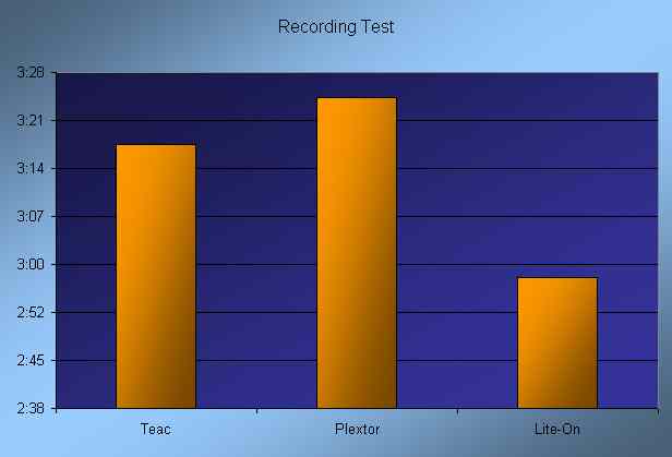 The Plextor comes in first by a few seconds, followed by the Lite-On and then the Teac. Again, not a whole lot of difference in the writing times, but for those who rewrite constantly the Plextor is the optimal choice.