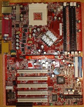 MSI tries to distinguish their motherboards from other manufacturers' by being first to use a red printed circuit board. This motherboard also features Nvidia's first motherboard chipset: the nForce. The Northbridge integrates a GeForce2 MX video card. This is also one of those motherboards that use a passive heatsink and has onboard LAN support.