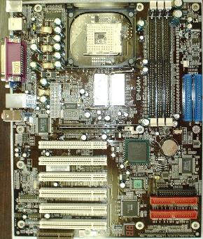 The EPoX 4G4A+ is a well designed motherboard. It has 11 Sanyo 3300 uF (micro-Farad) capacitors and three inductors around the CPU socket to ensure a clean electric signal. Similarly, two giant Teapo 4700 uF and smaller capacitors straddle the three 184-pin DDR memory slots.