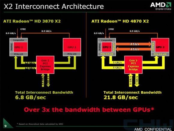 In true AMD form the 4870 X2 offers a generational leap in technology over the previous series of cards. It builds upon the 38XX series by adding dual interconnects between the GPU's as well as migrating to PCI Express Generation 2. The theoretical bendwidth of the card has been doubled from 2.5 to 5 GB/s with a total interconnect bandwidth of 21.8 GB/s as opposed to 6.8 GB/s for the 3870 X2.